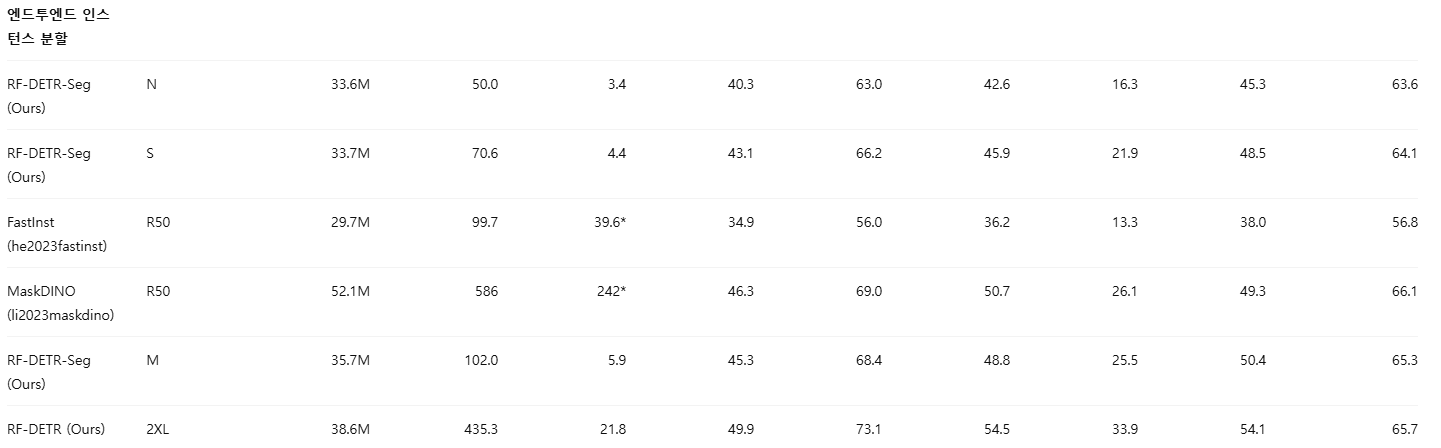 흥미롭게도, 학습 과정에서 명시적으로 등장하지 않았던 서브넷들 역시 높은 성능을 보이는 것을 확인하였으며, 이는 RF-DETR이 학습 시 보지 못한 아키텍처로도 일반화할 수 있음을 시사한다(cf. H). RF-DETR을 분할(segmentation) 문제로 확장하는 것 또한 비교적 간단하며, 경량의 인스턴스 분할 헤드(instance segmentation head)를 추가하는 것만으로 충분하다. 우리는 이 모델을 RF-DETR-Seg이라 부른다. 특히 이러한 확장은 실시간 인스턴스 분할(real-time instance segmentation)을 위한 파레토 최적 아키텍처를 발견하는 데에도 엔드투엔드 가중치 공유 NAS를 그대로 활용할 수 있게 해준다.