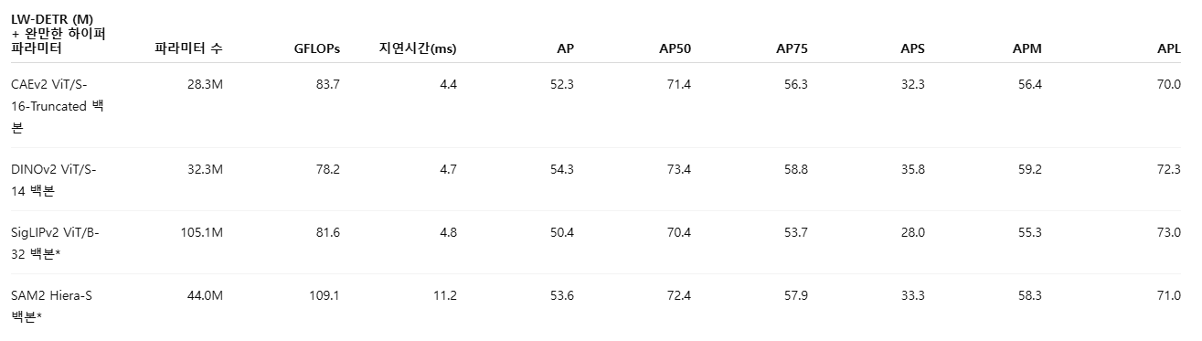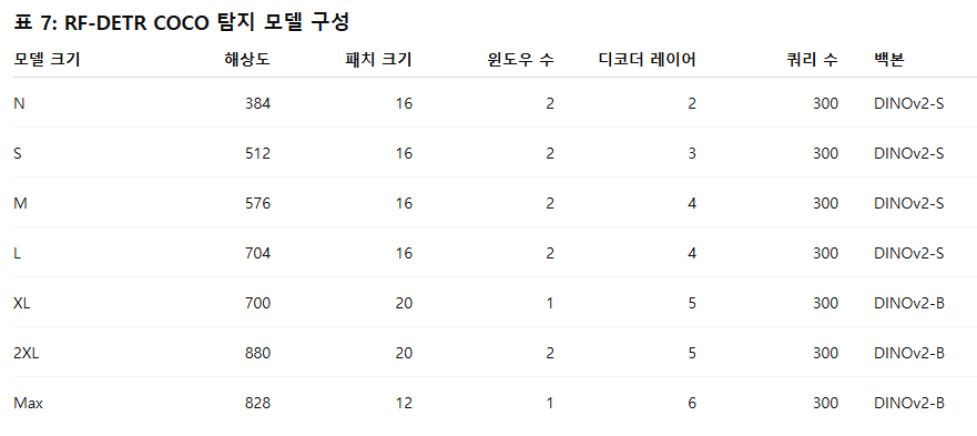 DINOv2-B 기반 모델을 생성할 때, 우리는 ViT-S에서 ViT-B로의 스케일링 전략을 그대로 따라 모든 레이어의 폭(width)을 두 배로 증가시켰다. 이러한 단순한 스케일링만으로도, 우리가 정의한 NAS 변동 축을 탐색하도록 허용하면 충분히 강력하고 차별화된 성능을 얻을 수 있음을 확인하였다. 주목할 점은, LW-DETR의 대형 변형들과 달리, 우리는 백본에서 더 높은 해상도의 특성 맵을 사용하지 않았다는 것이다.