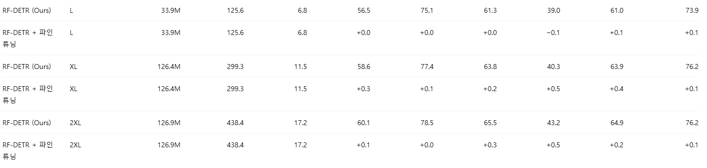 아래에서는 RF100-VL에서 RF-DETR의 L, XL, 2XL 크기 성능을 제시한다. 특히 RF-DETR (x-large)는 D-FINE 대비 0.5 AP 높은 성능을 보이며, RF-DETR (x-large)를 파인튜닝하면 추가로 0.4 AP의 성능 향상이 관찰된다.