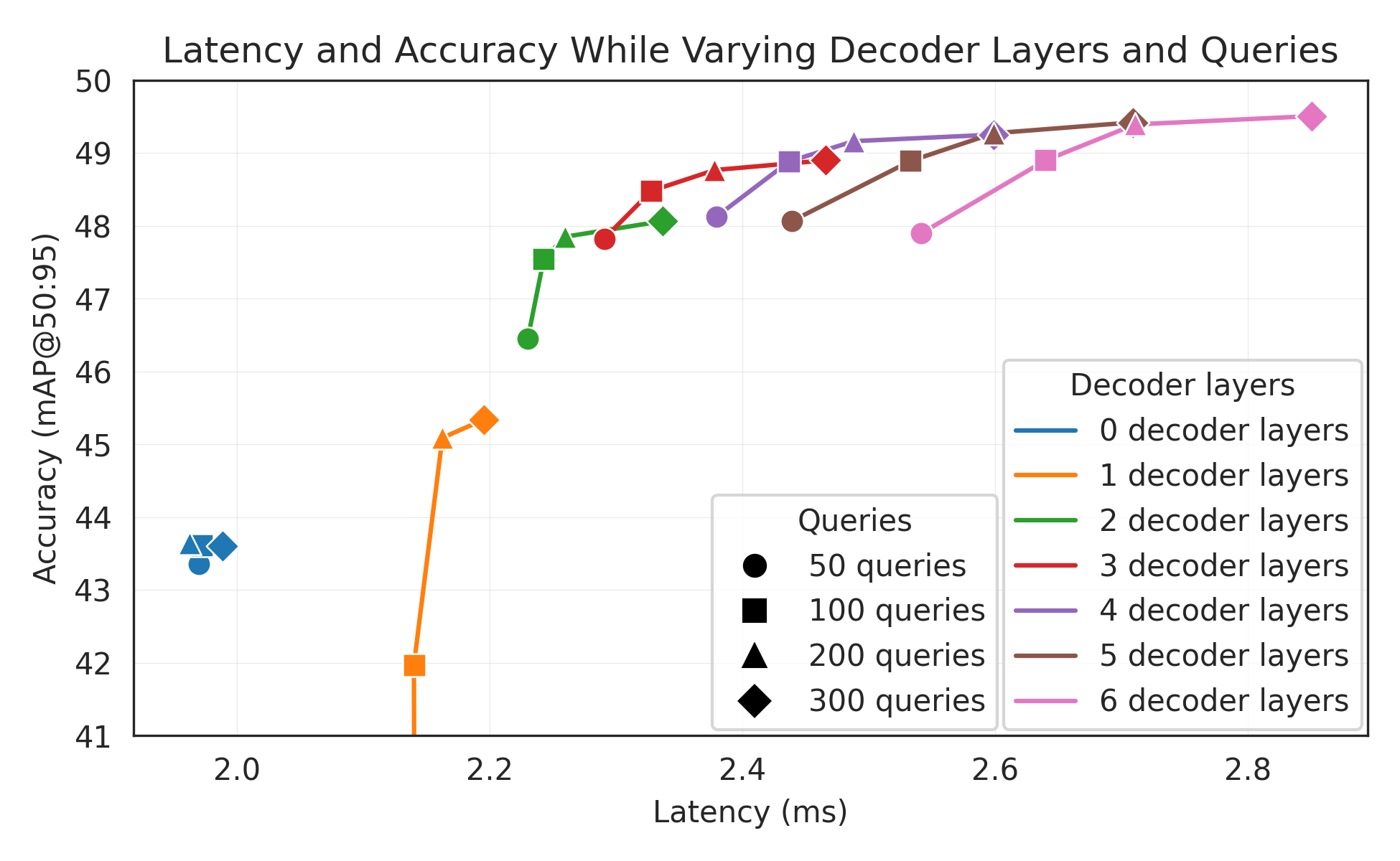 데이터셋의 특성 또한 최적 아키텍처에 영향을 미친다. RF100-VL에서 NAS를 수행한 결과, 낮은 지연시간 모델일수록 COCO 대비 더 적은 쿼리 수를 사용하는 경향이 있음을 발견하였다. COCO 모델은 동일한 지연시간 구간에서 항상 300개의 쿼리를 사용하는 반면, RF100-VL 데이터셋은 이미지당 객체 수가 더 적은 경우가 많아, 모든 객체를 찾기 위해 필요한 쿼리 수 자체가 더 적기 때문이다. 각 쿼리는 기본적으로 하나의 객체를 담당한다.
