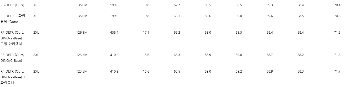 아래에서는 COCO에서 RF-DETR의 L, XL, 2XL 크기 모델 성능을 제시한다. 주목할 점은 D-FINE (x-large)가 mAP@50:95 기준으로 RF-DETR (x-large)를 상회한다는 것이다. 그러나 RF-DETR (2x-large)는 D-FINE을 0.8 AP 차이로 능가하며, COCO에서 60 AP를 돌파한 최초의 실시간 탐지기이다.