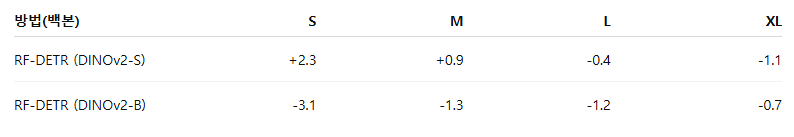 표 11: 유사한 지연시간에서 RF-DETR과 D-FINE의 mAP@50:95 격차