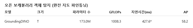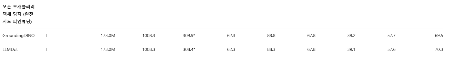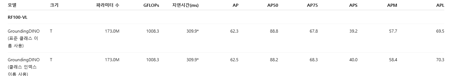 그러나 실험 결과, RF100-VL에서 GroundingDINO를 파인튜닝했을 때 두 경우의 성능은 거의 동일하게 나타났다. 이는 엔드투엔드 방식으로 모델을 단순히 파인튜닝하는 것이 오픈 보캐블러리 사전 학습의 이점을 상당 부분 상쇄시킨다는 점을 시사한다. 향후 연구에서는 파운데이션 사전 학습의 효과를 보존하면서 VLM을 효과적으로 파인튜닝하는 방법을 탐구할 필요가 있다.