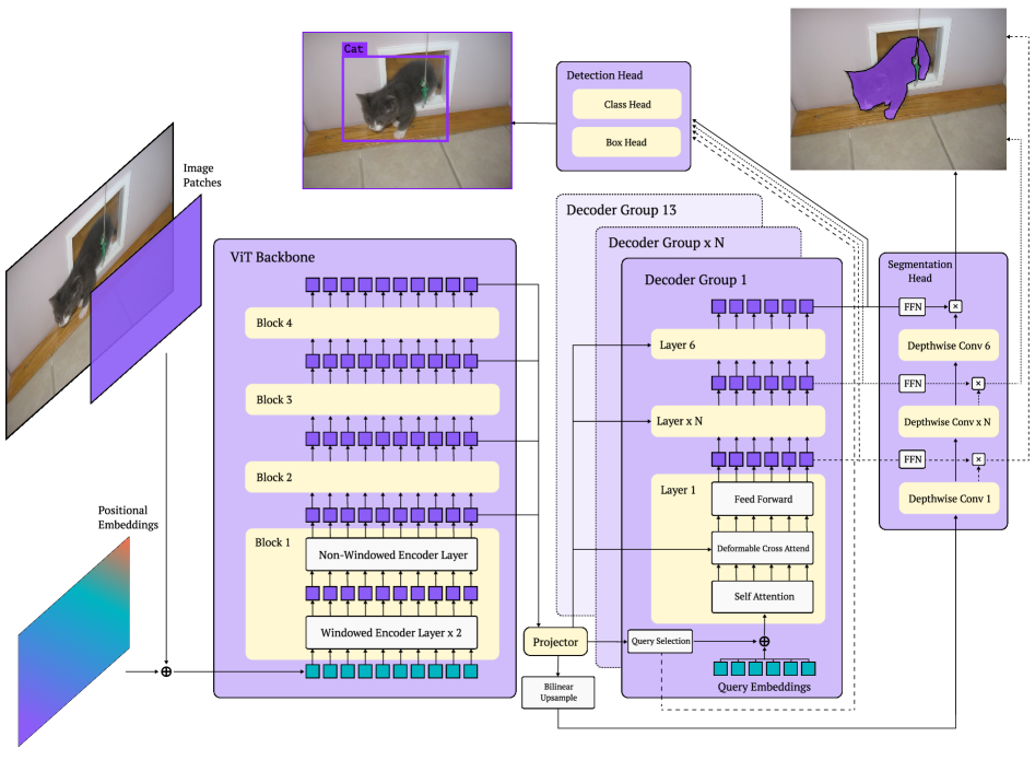RF-DETR은 사전 학습된 ViT 백본(backbone)을 사용하여 입력 이미지로부터 다중 스케일(multi-scale) 특징을 추출한다. 정확도와 지연시간의 균형을 맞추기 위해, 윈도우 기반(windowed) 어텐션 블록과 비윈도우(non-windowed) 어텐션 블록을 교차(interleave)하여 사용한다. 특히 변형 가능 크로스 어텐션(deformable cross-attention) 레이어와 분할(segmentation) 헤드는 모두 프로젝터(projector) 출력에 대해 이중선형 보간(bilinear interpolation)을 적용함으로써, 특징의 공간적 조직(spatial organization)을 일관되게 유지한다. 마지막으로, 추론(inference) 시 디코더 드롭아웃(decoder dropout)을 가능하게 하기 위해 모든 디코더 레이어에 탐지 및 분할 손실(detection and segmentation losses)을 적용한다.