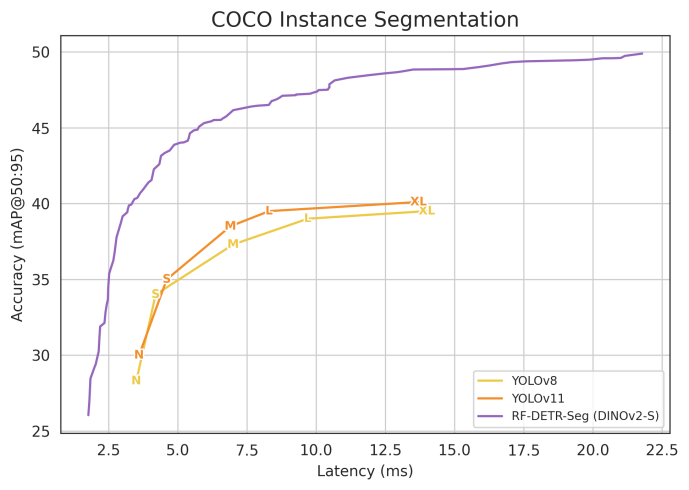 아래에서는 COCO 인스턴스 분할 벤치마크에서 RF-DETR의 L, XL, 2XL 크기 성능을 제시한다. RF-DETR은 스케일을 키울수록 유의미한 성능 향상을 보인다. 반면, YOLOv8과 YOLOv11은 스케일 확대로 인한 성능 개선이 제한적이다.