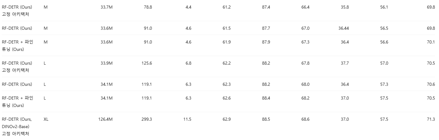 중요한 점은, D-FINE 모델 패밀리를 확장하려면 상당한 추가 엔지니어링 노력이 필요한 반면, RF-DETR 모델 패밀리는 동일한 NAS 탐색 공간에서 재학습 없이 더 높은 지연시간 변형을 간단히 샘플링함으로써 확장이 가능하다는 것이다. 우리는 대형 변형들에 대한 COCO 및 RF100-VL 결과를 표 12, 13, 14에 제시한다. 또한, 지연시간 100ms 미만에서의 최대 성능을 보여주기 위해 각 데이터셋에 대해 RF-DETR Max 변형도 포함하였는데, 이는 다른 모델 패밀리들이 도달하지 못한 스케일이다.