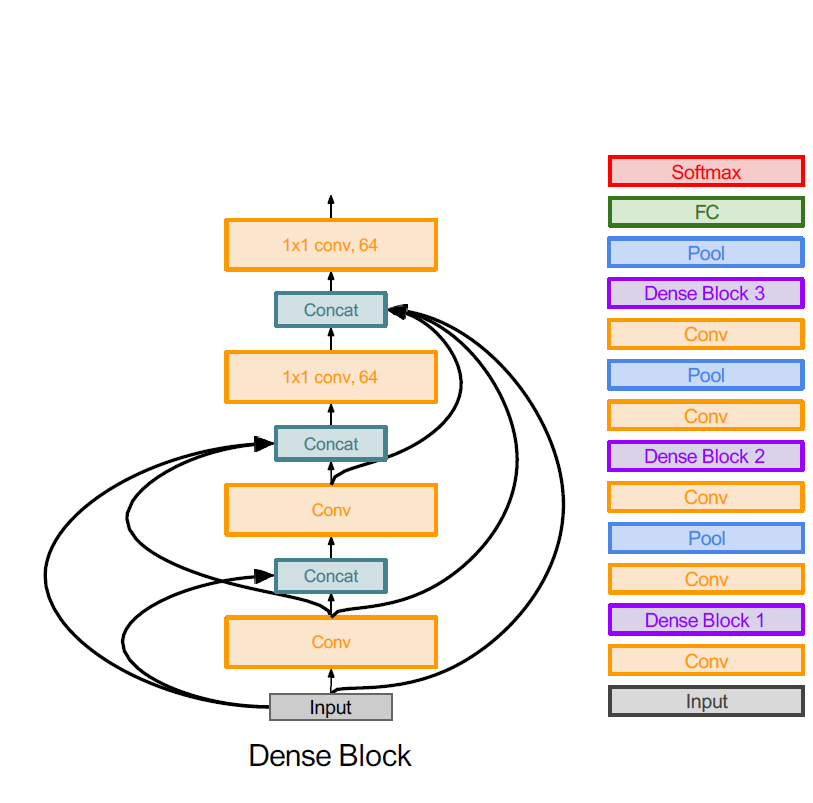 - 특징 재사용 장려: Dense 블록에서는 각 계층이 다른 모든 계층과 연결되므로, 이전 계층에서 추출한 특징을 현재 계층에서 재사용할 수 있습니다. 이는 모델이 훈련 데이터의 다양한 특징을 잘 학습하고, 작은 데이터셋에서도 효과적으로 일반화할 수 있도록 도와줍니다.