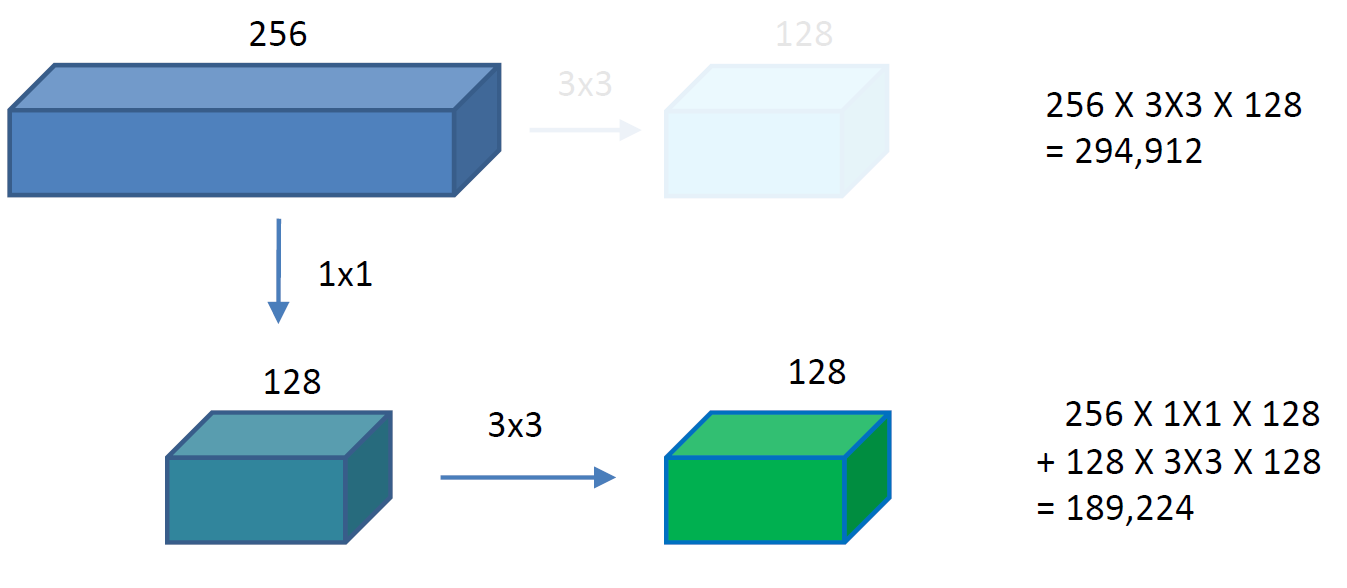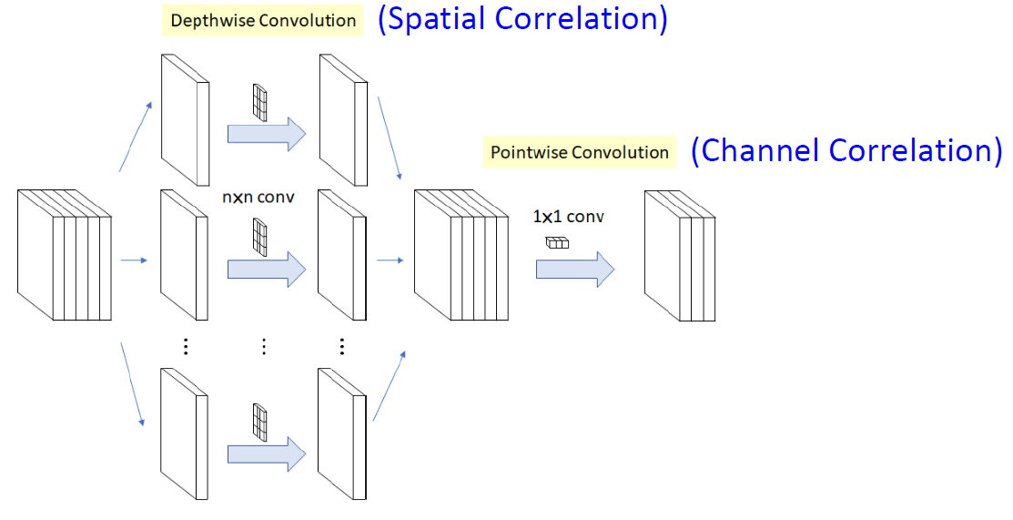 Depthwise Separable Convolution은 기존의 컨볼루션에 비해 매개 변수 수와 계산 비용을 크게 줄여준다. Depthwise Convolution에서는 입력 채널별로 필터를 공유하기 때문에 매개 변수 수가 감소하고, Pointwise Convolution에서는 채널 간의 선형 결합을 통해 필터 크기가 작아지기 때문에 계산 비용이 감소한다. 이를 통해 모델의 효율성과 경량화를 달성할 수 있다. Depthwise Separable Convolution은 모바일 장치와 같은 계산 자원이 제한된 환경에서 특히 유용하며, 작은 모델 크기와 빠른 추론 속도를 제공한다.