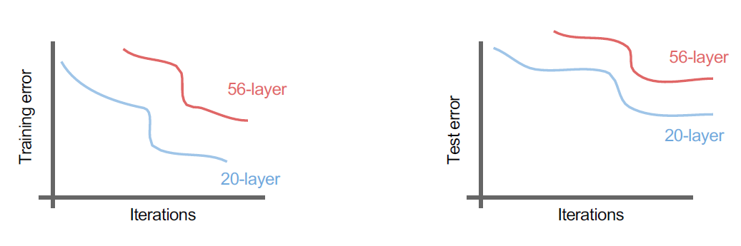 보통의 합성곱 신경망에 더 깊은 계층을 추가하면 모델의 성능이 저하될 수 있습니다. 이는 더 깊은 모델이 과적합으로 인해 성능이 저하되는 것이 아니라는 것을 의미합니다. 즉, 더 깊은 신경망은 훈련 및 테스트 오류 모두에서 성능이 악화됩니다.