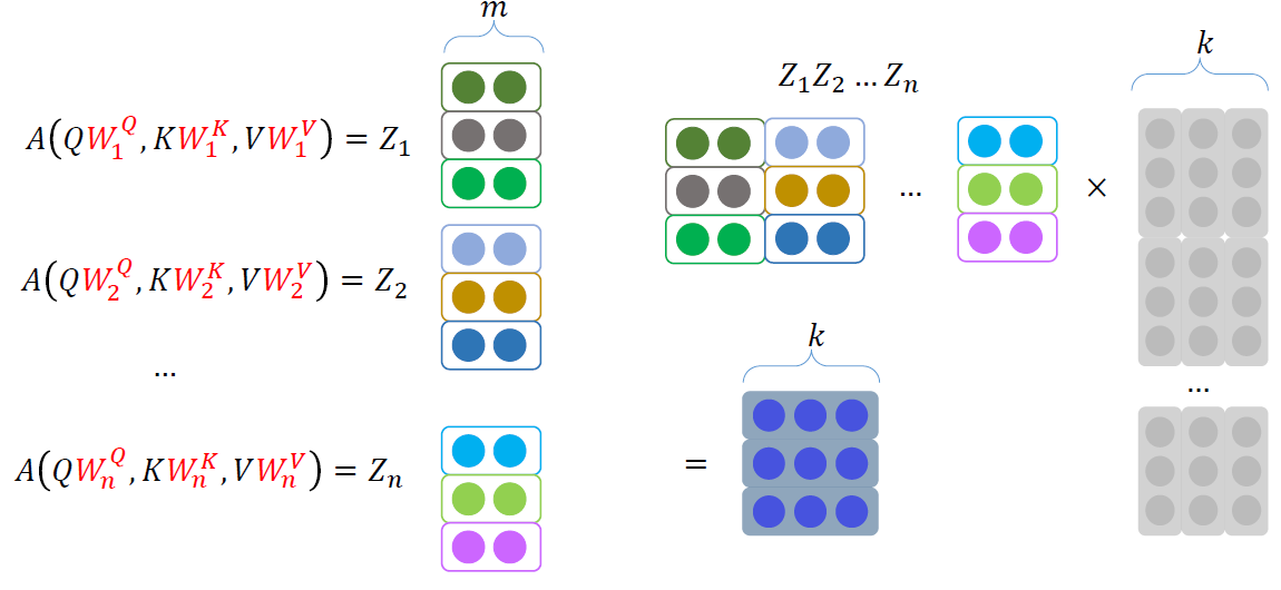 이전 설명에 따라 여러 개의 서로 다른 선형 변환을 통해 병렬로 수행하면 다음과 같다.