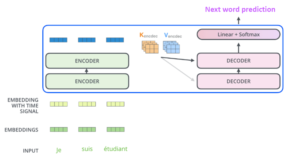 각각의 인코더의 출력은 어텐션 벡터 𝐾 및 𝑉 세트로 두자. encoder-decoder attention layer에서 이들을 활용할 것이다. 그렇게 적용되면 다음의 그림과 같을 것이다.