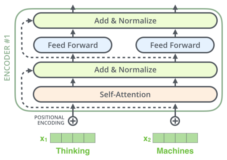 입력 문장에 단어를 삽입한 후 각 단어는 인코더의 두 계층을 통해 흐른다.