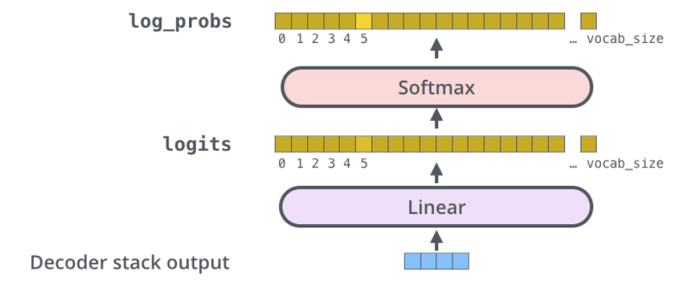 Linear 레이어는 디코더 스택에 의해 생성된 벡터를 logits 벡터라고 불리는 훨씬 더 큰 벡터로 투영하는 간단한 완전히 연결된 신경망이다.