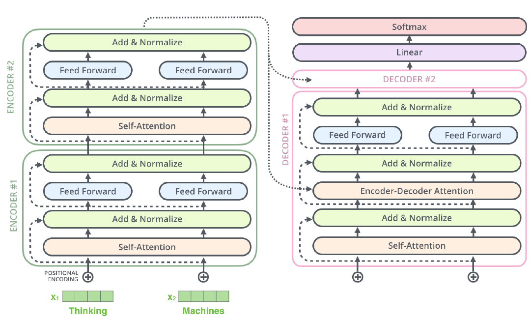 2개의 적층된 인코더와 디코더로 구성된다면 다음과 같이 변할 것이다.