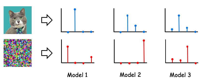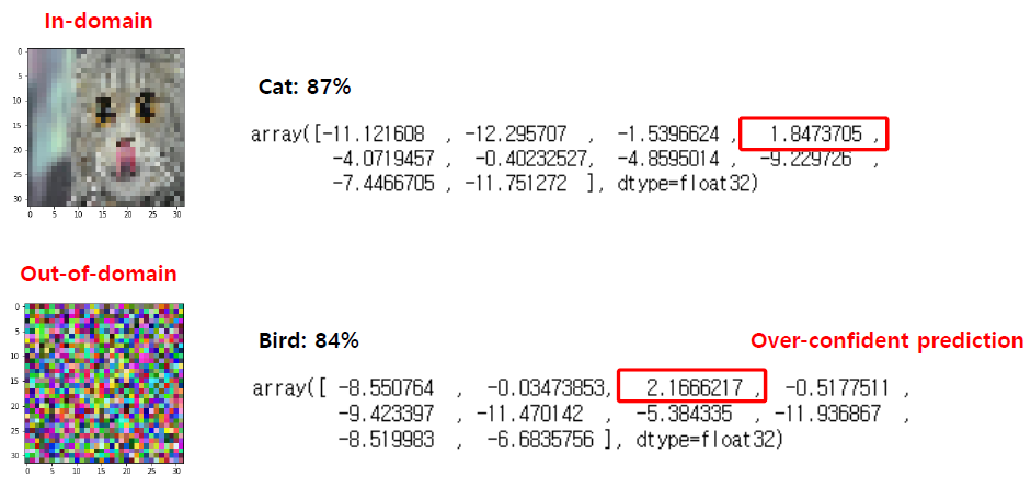 우리는 일반적으로 분류를 위해 softmax를 사용한다. 따라서 도메인에 있는 이미지의 경우 softmax는 선명한 출력을 생성하고 아니면 모호한 출력을 생성한다.