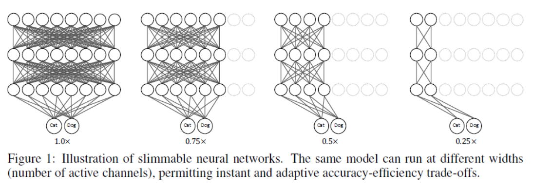 Slimmable Neural Networks는 주어진 입력에 대해 다양한 너비(즉, 네트워크의 크기나 용량)를 가진 모델을 훈련하고, 추론 단계에서 다양한 연산 요구사항에 맞게 이를 조정할 수 있게 해주는 모델이다. 이 방법은 하나의 모델이 다양한 하드웨어 환경에서 작동하도록 하거나, 더 적은 리소스를 사용하면서 성능을 유지하거나 개선하도록 하는 데 유용하다.