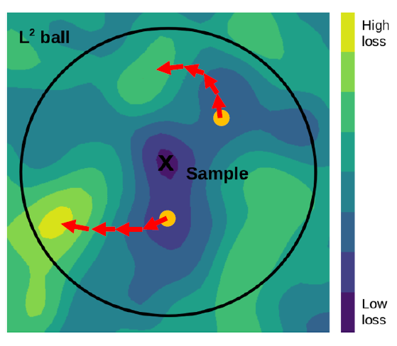 데이터 주변의 임의 시작점을 기준으로 FGSM을 반복적으로 적용하고 실패할 경우 임의의 지점에서 다시 시작한다.