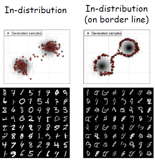 이를 위해서는 일반적으로 주어진 분포 외 데이터는 일반적으로 분포 외 샘플을 모델링하기에 충분하지 않다. 즉, 유통되지 않은 샘플이 더 필요하다. 그렇다면 GAN을 사용하면 되지 않을까? 실제 GAN을 사용했더니 다음의 형태를 보였다.