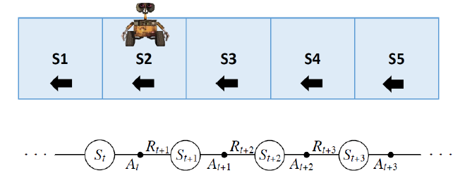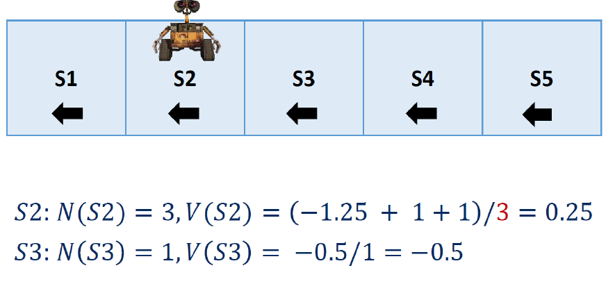 "Mars Rover" 예제에서는 우리가 상태 전이 확률 𝑃(𝑆′|𝑆,𝐴)과 같은 모델에 대한 정보를 알지 못한다. 정책은 모든 상태에서 "왼쪽으로 이동"만 하는 것이며, 보상은 이동할 때마다 -1이 주어지고, S1에 도착하면 +1이 주어진다. 할인율은 𝛾=0.5로 설정된다.