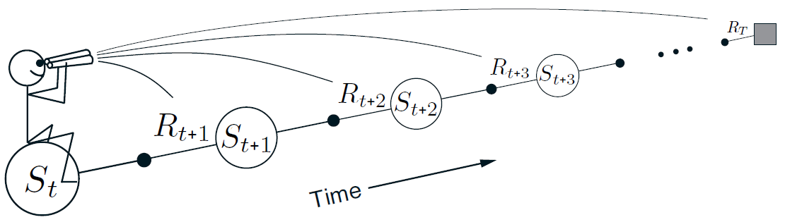 리턴은 총 감가된 보상을 나타내며, 𝑅𝑡+1, 𝑅𝑡+2, ..., 𝑅𝑇을 𝛾로 감가하여 계산한다. 𝛾는 할인율로, 미래의 보상에 대한 중요도를 조절한다.