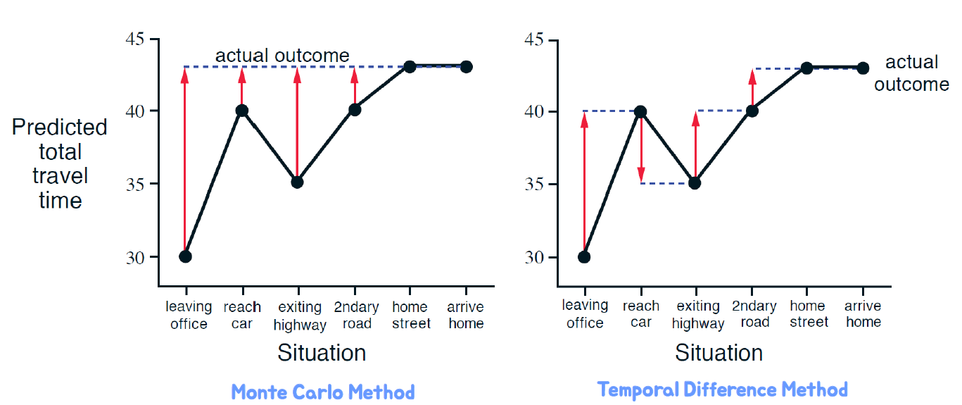 즉, MC와 TD를 비교하면 다음과 같다.